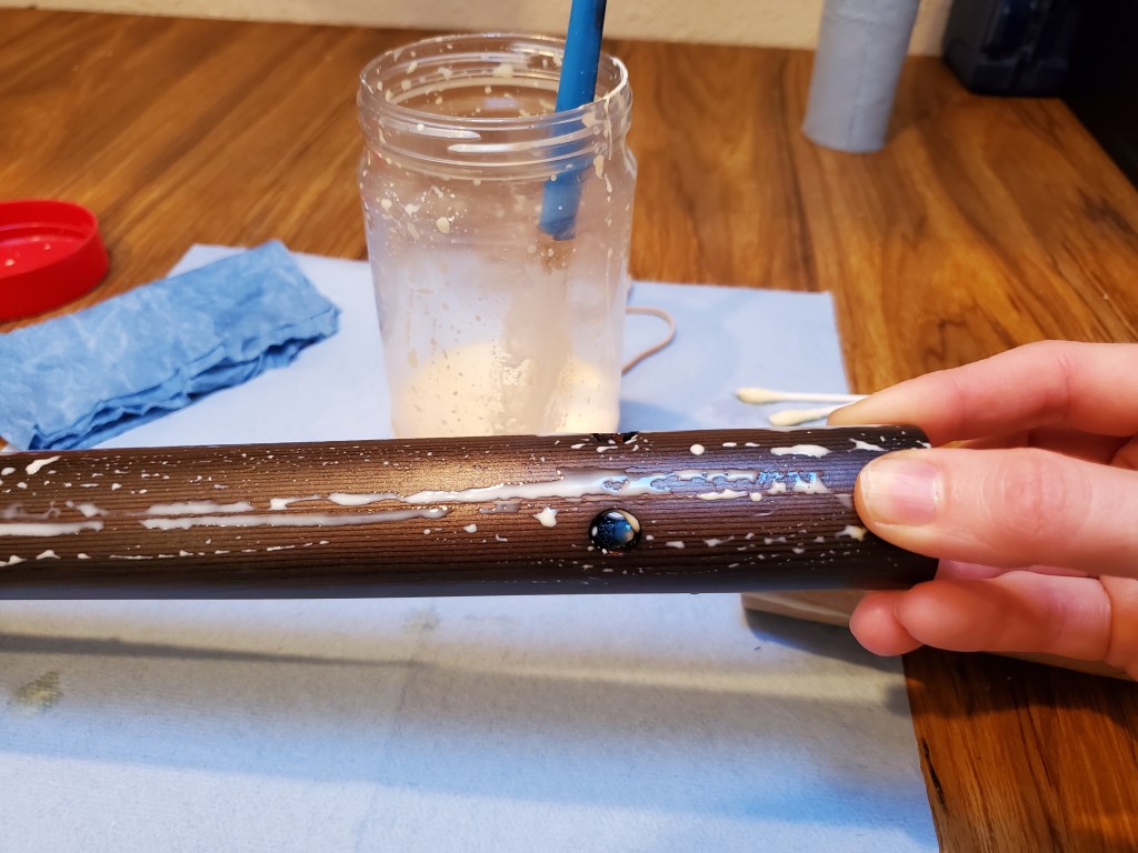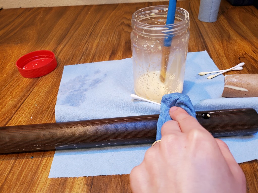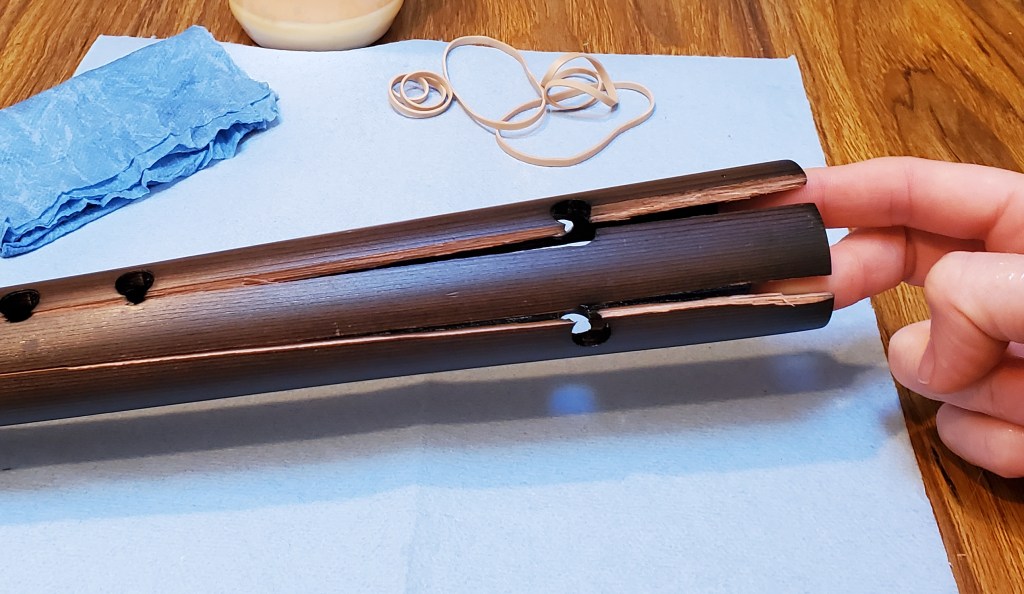 If your flute has been smashed or has a crack but all the pieces are still attached, you will need to find something cone shaped to gently spread the crack(s) apart. I used a toilet paper roll that I smashed into a cone shape, it worked great! Of course we have wooden mandrels at the shop to spread flutes, but you really don’t need anything that fancy!