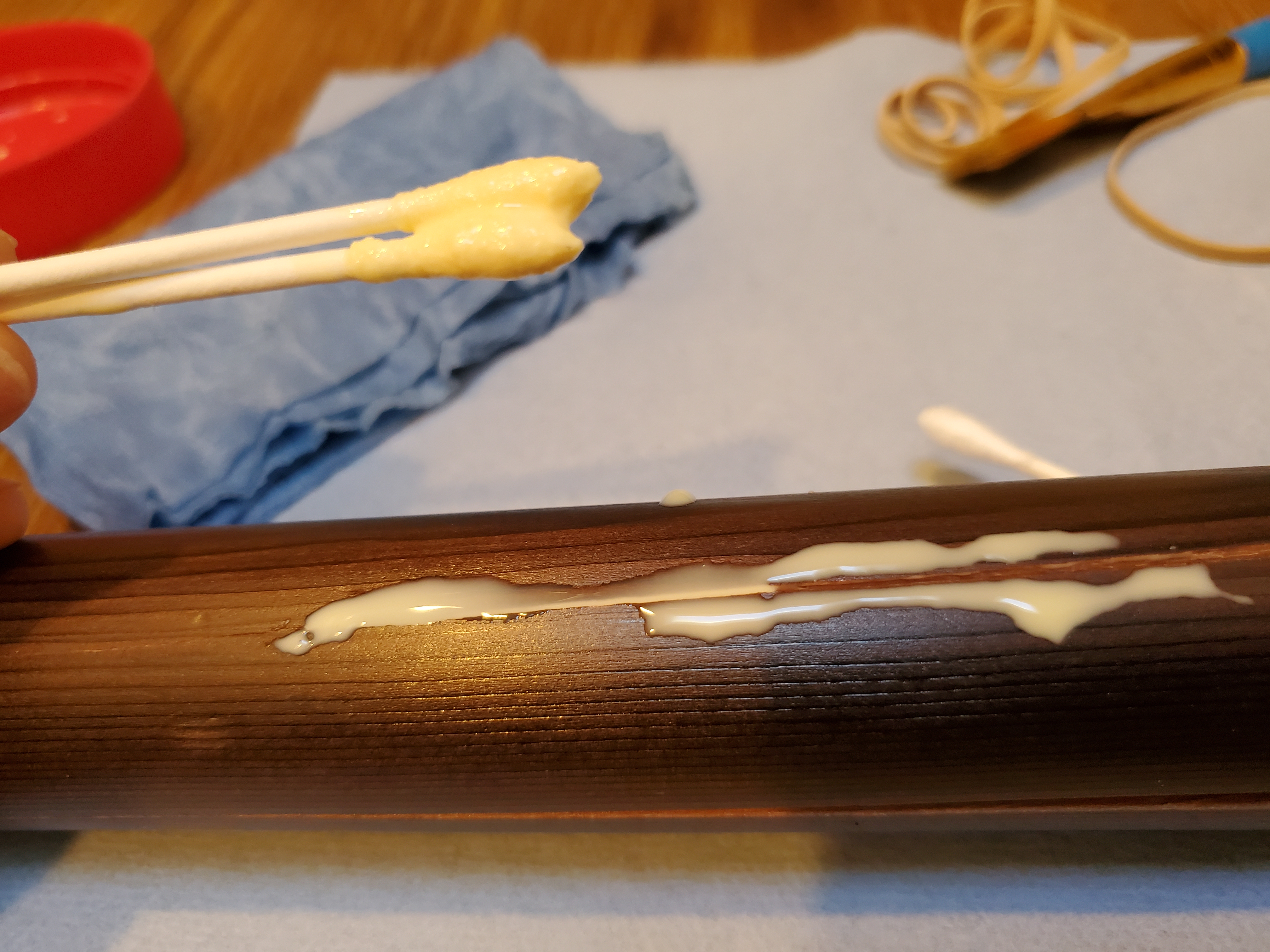 Some glue will extrude from the cracks, this is a good sign that you have applied enough, while holding the flute together, gently wipe the excess glue off the outside of the flute with a damp rag.