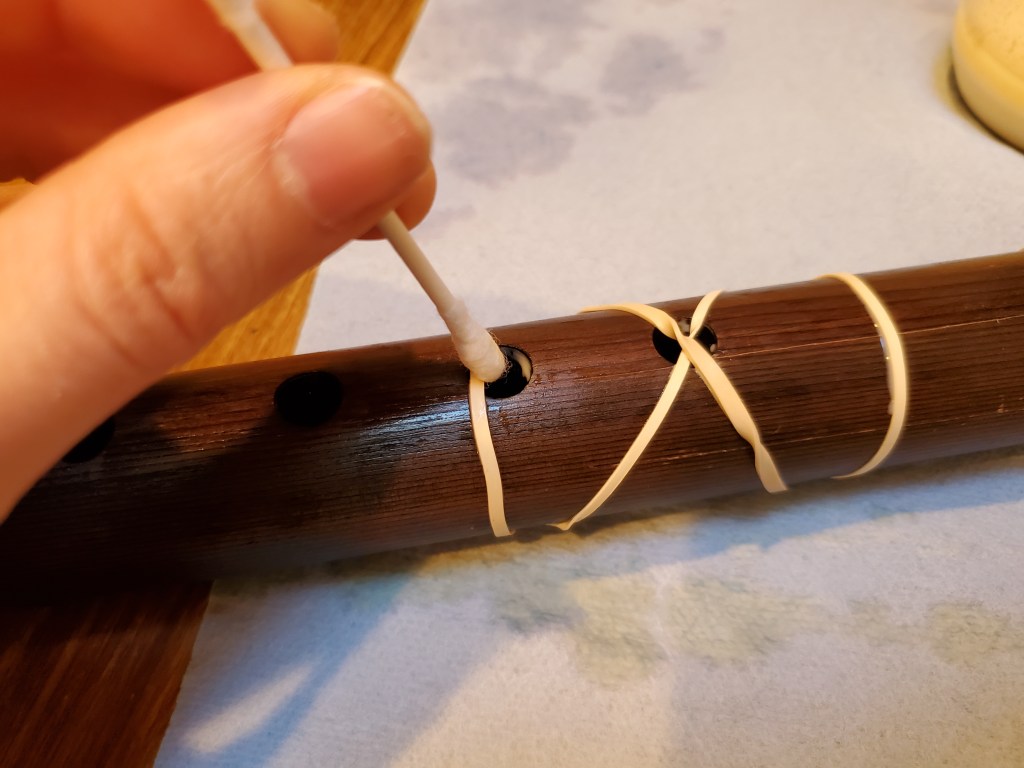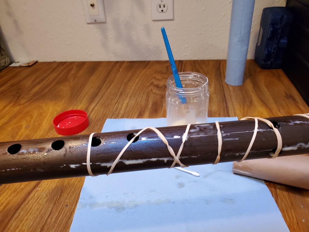 Once dry remove the rubber bands. Often there will not be any further cleanup necessary, the flute should be back to normal, voice wise, but you have the option of taking the repair a step further.